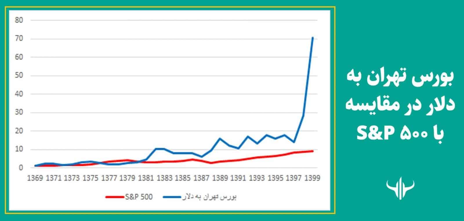 برای مقایسه این دو بازار میتوانیم شاخص S&P 500 را با «شاخص کل / دلار» مقایسه کنیم. یعنی هزار دلار در بازار ایران چقدر سود (به دلار) میدهد، در بازار آمریکا چقدر؟