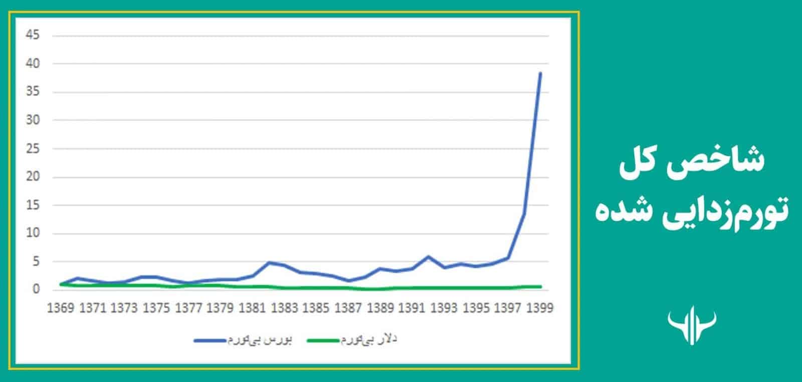 همانطور که میببینید شاخص کل بدون تورم بازدهی خوبی داشته و قدرت خرید شما بیشتر شده است. اگر پولی را که با آن در سال 69 میشد یک واحد آپارتمان نوساز خرید، در بورس میگذاشتید، الان میتوانستید 40 واحد آپارتمان بخرید. اما اگر پول حاصل از فروش آپارتمان را دلار میخریدید، امروز از فروش دلار میتوانستید نصف همان واحد را خریداری کنید.