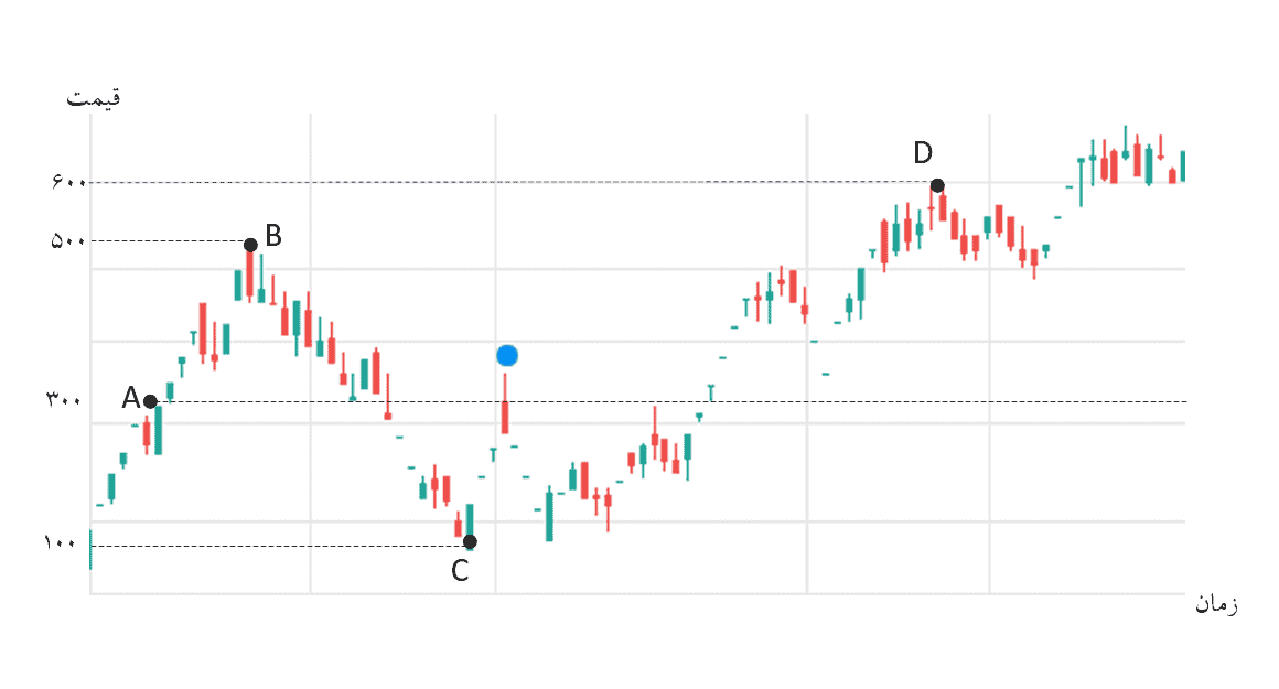 با یک مثال دیگر سعی میکنیم این موضوع را بهتر توضیح دهیم. نمودار زیر را در نظر بگیرید. این شکل مربوط به نمودار قیمت-زمان یکی از سهمهای بازار سرمایه است. در نقطه آبی، به هر سهم سودی معادل 20 تومان تعلق گرفته است.